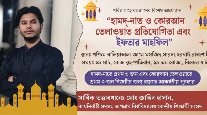 রাজধানীতে ‘বেতাগী প্রগতী ফোরাম’ ঢাকার উদ্যোগে পবিত্র মাহে রমজান উপলক্ষে এক ইফতার ও দোয়া মাহফিল অনুষ্ঠিত হয়েছে। (১৩ মার্চ ২০২৬ইং তারিখ ) শুক্রবার রাজধানীর ফার্মগেট হোটেল নিউ স্টার মিলনায়তনে বিস্তারিত পড়ুন