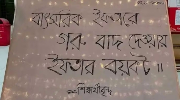 আগামী ৪ মার্চ ঢাকা বিশ্ববিদ্যালয়–এর বিভিন্ন হলে আয়োজিত ইফতার কর্মসূচিতে গরুর মাংসের পরিবর্তে মুরগির আইটেম রাখার সিদ্ধান্ত নিয়ে অসন্তোষ জানিয়েছেন ডাকসু ও হল সংসদের নির্বাচিত প্রতিনিধিরা। তাদের অভিযোগ, শিক্ষার্থীদের মতামত